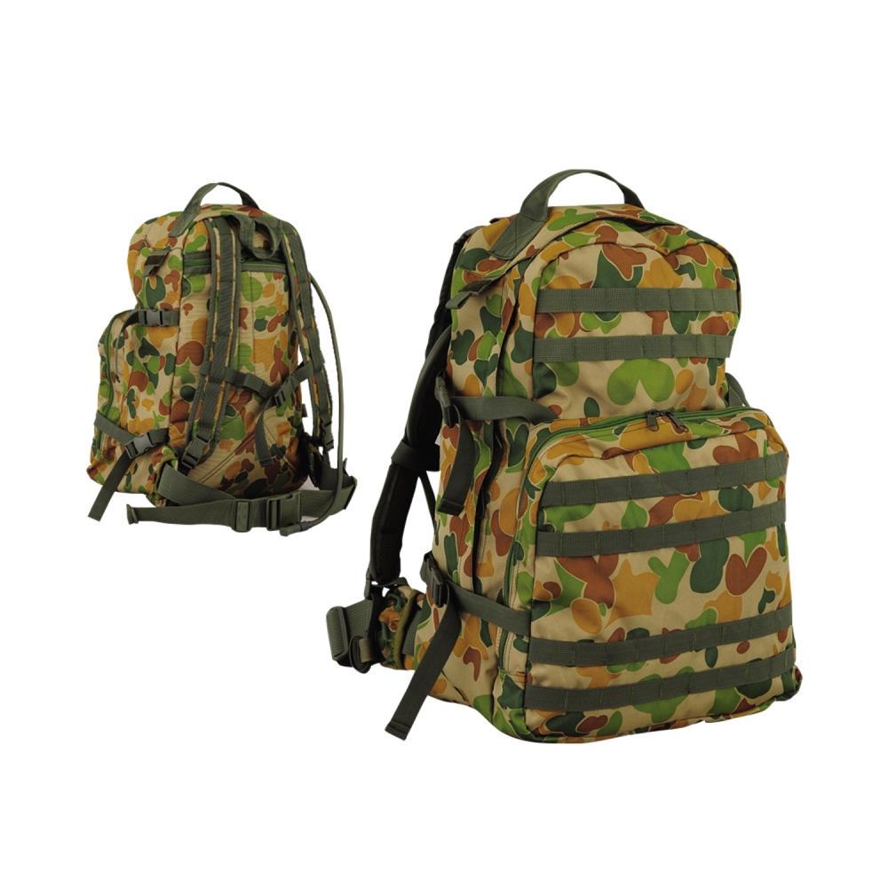 Color: Camouflage Material Specs: Outer Covering 1000D Polyester Cordura, Polyester lining, Nylon Coil zip, Plastic buckles, Velcro, Polyester web, 2.5L TPU water reservoir, straight type bite valve. Easy washable & detachable water sac.
